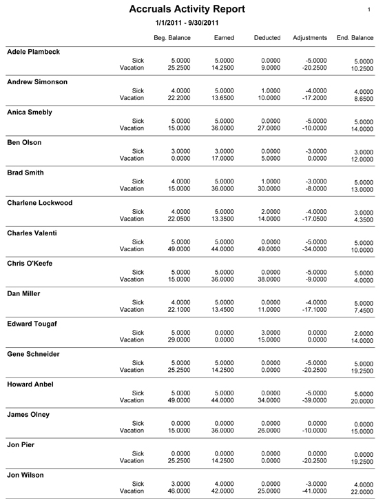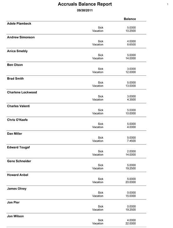 This new report shows the balance for each accrual account as of a specific point in time for each employee. The Accruals Balance report lists your employees and their available time off for vacation days, sick time, or any other type of time-off accruals you track in Staff Files.